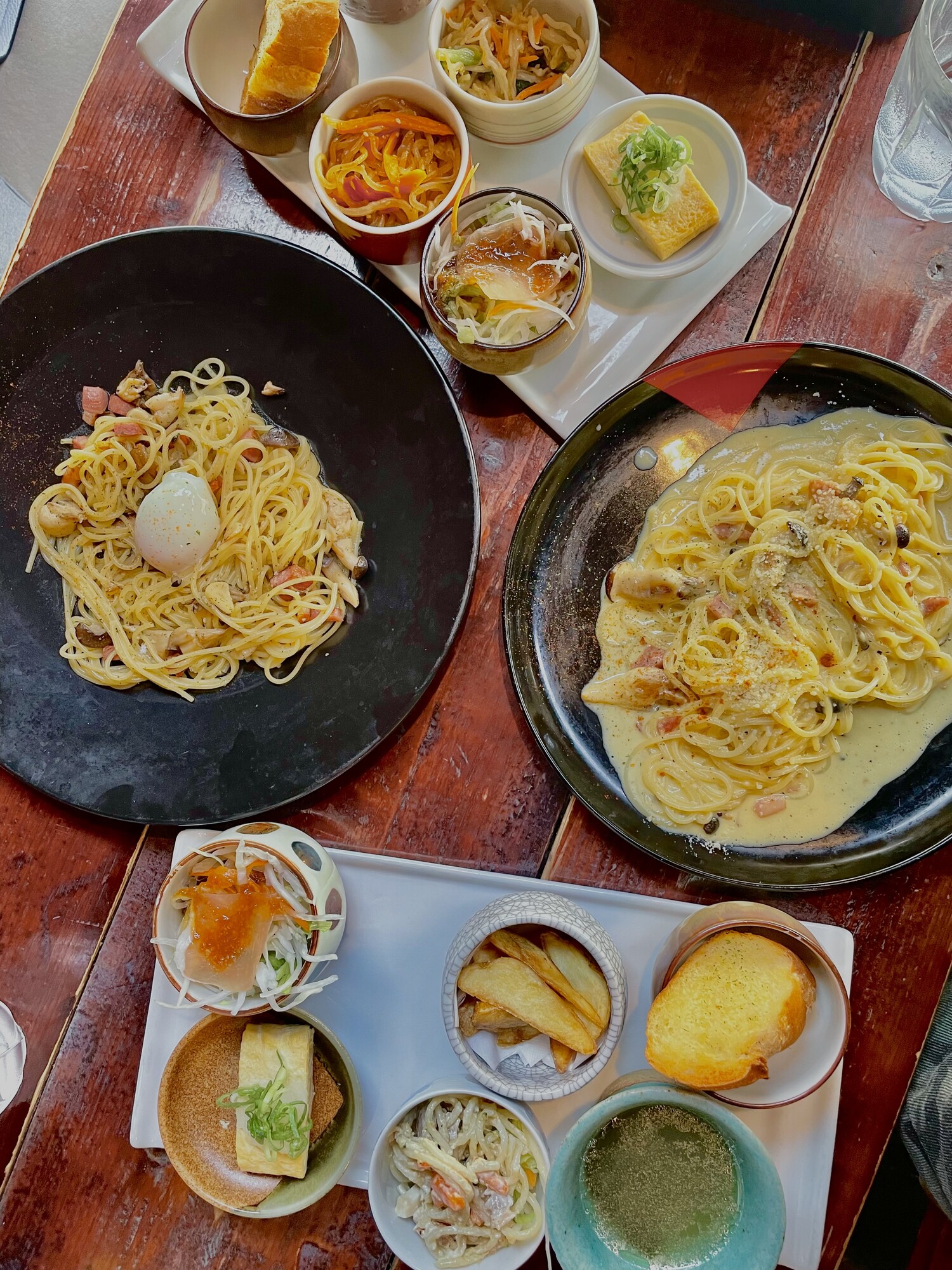 ランチはパスタにサラダや小鉢がセットになっていて、テーブルに運ばれてきた瞬間すごく華やか。普段のランチよりも少し贅沢な気分になれました。こうやって目でも楽しめるお料理って、なんだかテンション上がりますよね。