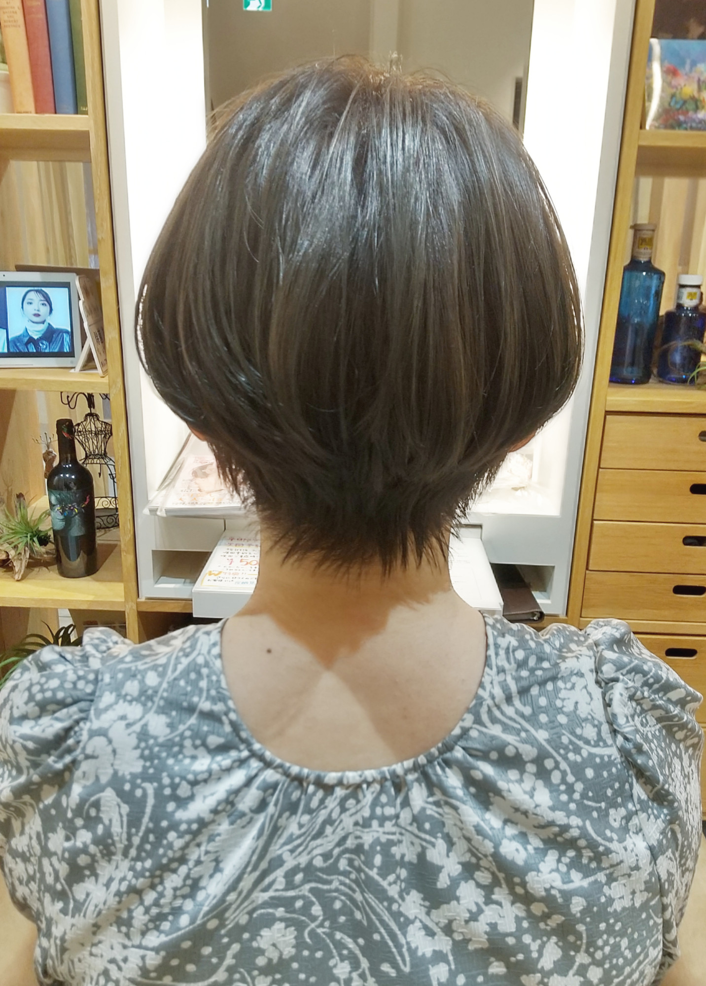 - マッシュショートシルエットでハチ周りのふくらみを抑えて面長もカバーして、後頭部もふんわりオシャレに!横顔美人効果ありです^^耳にかけてもやぼったくならないように質感調節し、お家でもスタイリングが簡単な再現性の高い、肌馴染みのよいカットをご提供します♪