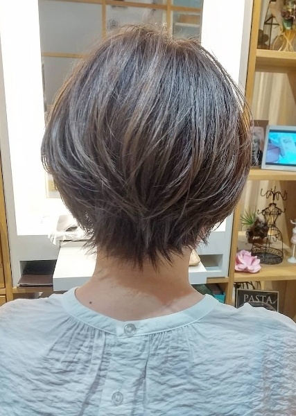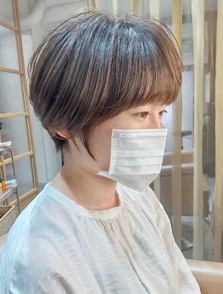 ナチュラルなマッシュショートシルエットでハチ周りのふくらみを抑えて面長もカバーして、後頭部もふんわりオシャレに!横顔美人効果ありです^^耳にかけてもやぼったくならないように、立体的に頭の形がきれいに見えるように質感調節し、お家でもスタイリングが簡単な再現性の高い、肌馴染みのよいカットをご提供します♪
