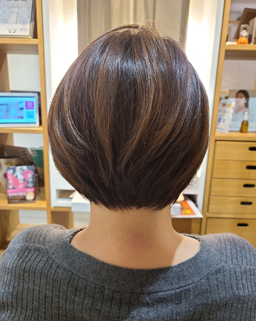 - カットとカラーはローライトをいれて、髪が伸びてきたときの根元のプリンが目立たないようにしています。