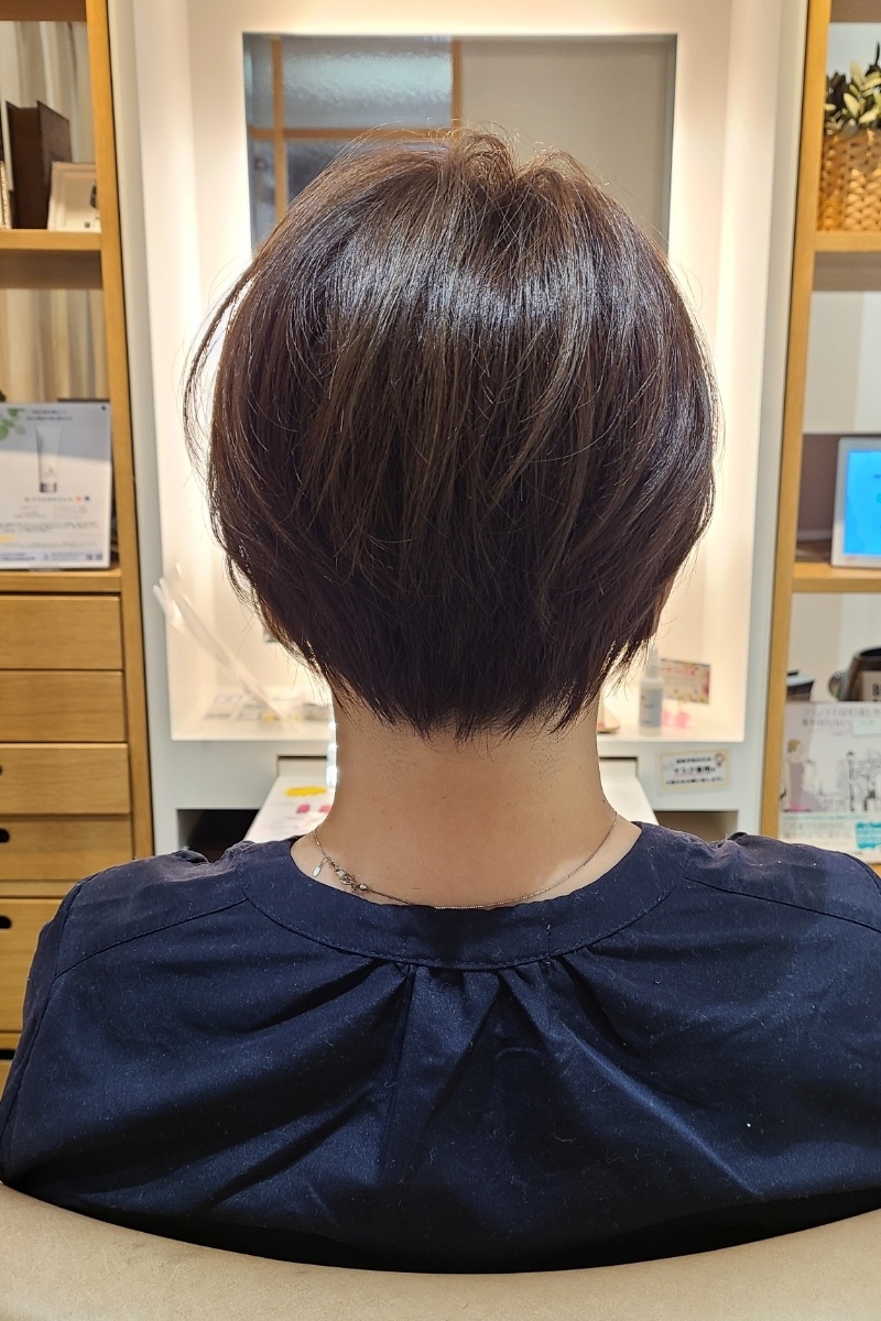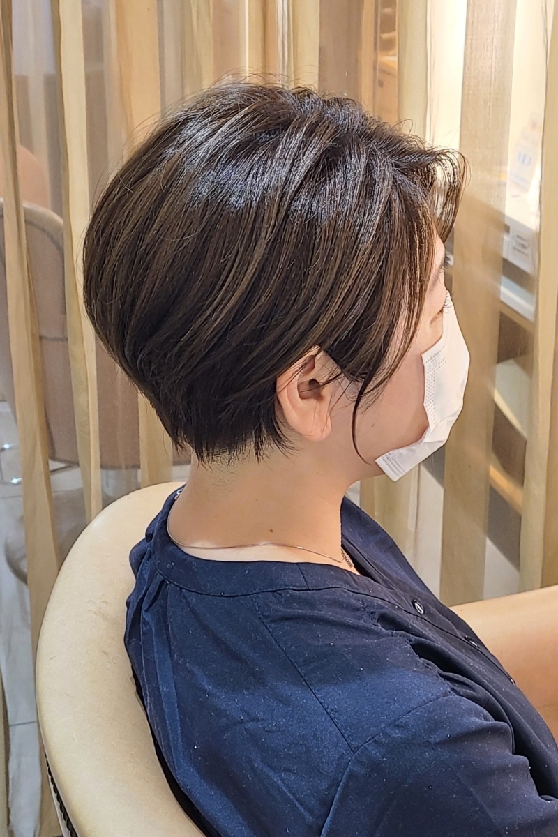 - 癖毛で膨らむ、毛量が多いお客様で、耳回りや、襟足をスッキリとさせたショートスタイルです。