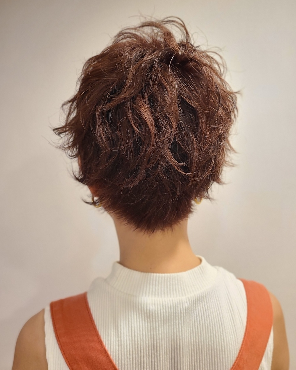 - 癖毛の動きをいかした、ベリーショート一度ブリーチでトーンアップして、オレンジが強めの元気なカラーに!