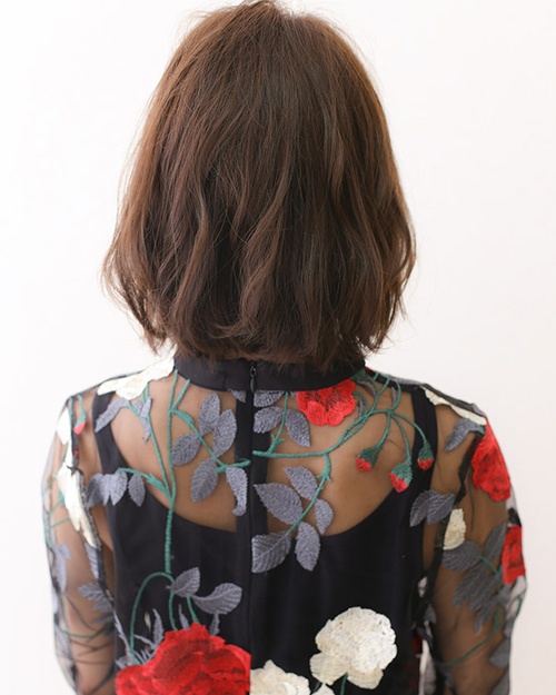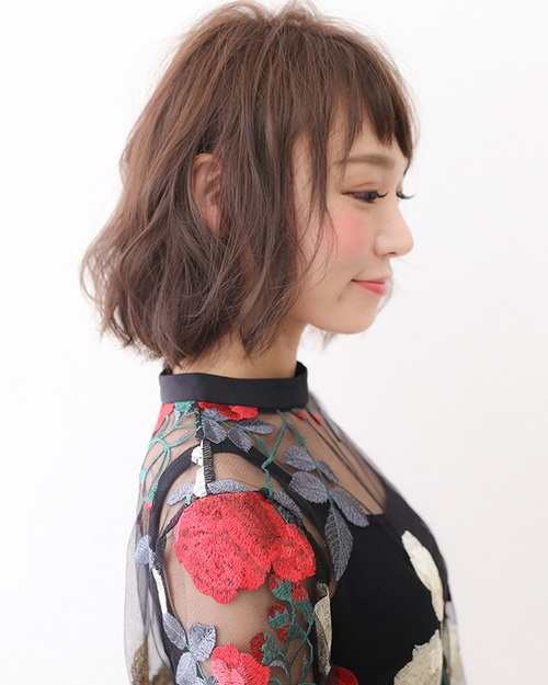 - 伸ばしかけの方にオススメ!扱いやすいボブレングスに軽やかなウェーブパーマをプラスした全体的に女性らしい丸みを感じる長めのボブスタイル。程よいカールとショートバングを合せた幅広い年代に受ける好感度ウェーブボブスタイルです☆スタイリングもしっとりめのワックスをもみこんで終わりの簡単スタイリングヘアです!