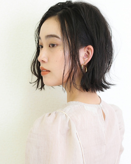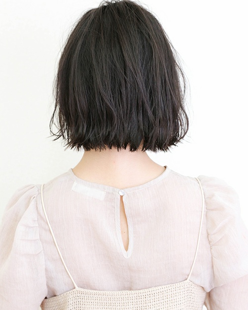 - 切りっぱなしボブにカットしアイロンで外ハネに!仕上げにオイルでスタイリングして抜け感をプラス!